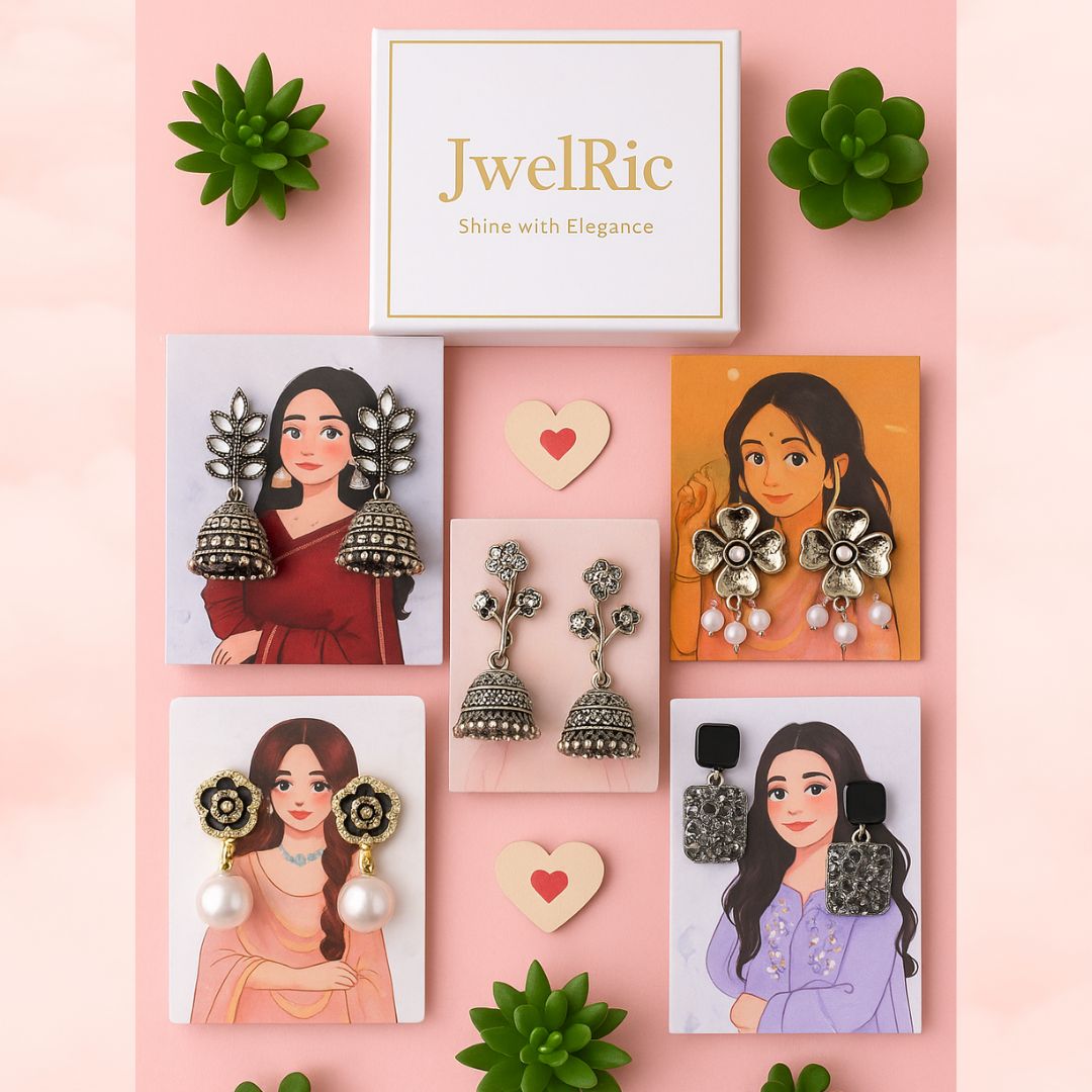Each pair in this handpicked collection is crafted with a premium oxidised finish and unique designs – from bold jhumkas to elegant studs – making it a must-have for every jewellery lover. Whether it’s a festive occasion, a wedding, a college day, or a casual outing, these earrings add instant glamour to your look.